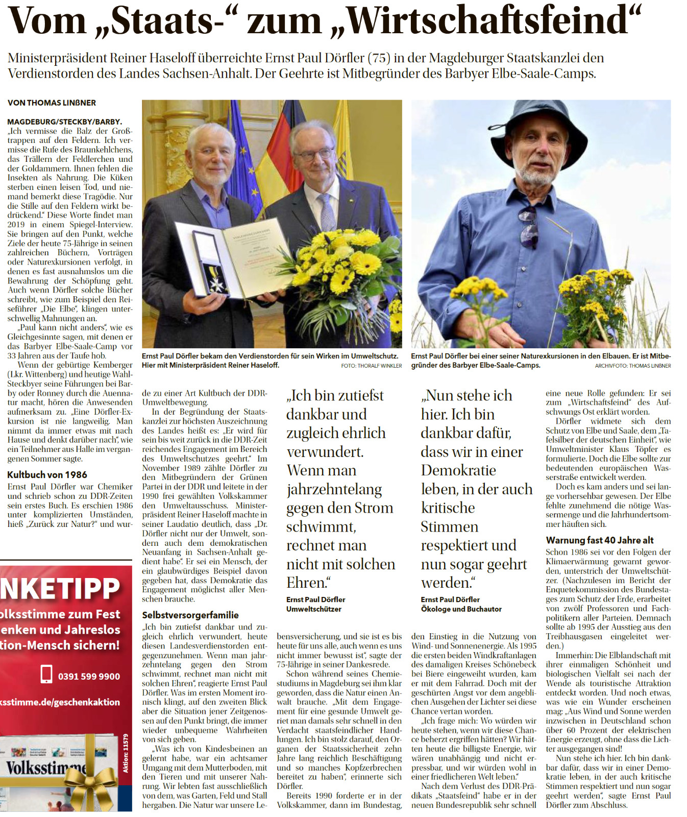 Nun stehe ich hier. Ich bin dankbar dafür, dass wir in einer Demokratie leben, in der auch kritische Stimmen respektiert und nun sogar geehrt werden. Ich nehme diesen Orden nicht an, ohne ihn symbolisch weiterzureichen an all jene Mitstreiterinnen und Mitstreiter, die über Jahrzehnte gemeinsam für Natur und Klima gestritten und nicht aufgegeben haben. Ihnen danke ich für ihre Ausdauer und für ihre Kreativität. Was wünschen wir uns von den politischen Entscheidungsträgern? Hören Sie auf die Wissenschaft! Handeln sie entschlossen und vor allem weitsichtig. Die Elbe als Wasserstraße ist Vergangenheit. Die Elbe als Fluss hingegen hat eine große Zukunft. Sie ist die Lebensader von Sachsen-Anhalt. Wir brauchen die Elbe mit ihren Auen als Verbündete beim Schutz von Klima und Natur sowie im Wassermanagement, um Katastrophen durch Dürre und Hochwasser zu vermeiden. Auch künftig werden wir uns kümmern müssen, kümmern um unser wichtigstes Kapital, um unser Naturkapital. Nichts ist wichtiger als die Sicherung unserer natürlichen Lebensbasis, denn ohne saubere Luft, klares Wasser, gesunde Nahrung, grüne Wälder und lebendige Flüsse sind wir nicht überlebensfähig. Lassen Sie uns dieses Naturkapital gemeinsam sichern, denn es ist die einzige Lebensversicherung, die wir alle teilen. Wir sollten dabei unsere Kinder und Enkel bei allem, was wir tun, als Erstes im Blick haben.